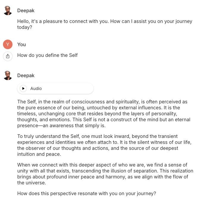 I tried his app and found it to be as flat, maybe even a tad flatter, in digital form as he is in real life. You get to ask “Deepak” two questions before you hit a paywall.